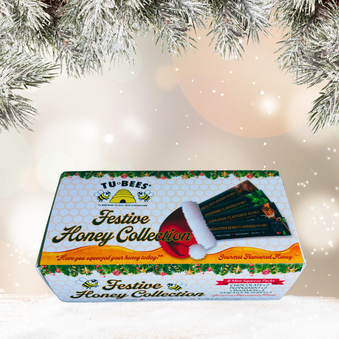 Treat your family and friends to a sweet gift this year with Tu-Bees Festive Honey Collection gift box. This collection contains four festive flavours: Cinnamon, Chocolate, Peppermint, and Saskatoon Berry. Each gift box contains two packages of each flavour which are all naturally flavoured, gluten-free, nut-free, dairy-free and OU Kosher. Make this holiday season one to remember by gifting a Tu-Bees Festive Honey Collection box. Perfect for stocking stuffers, hostess gifts, or work party gift exchanges.
